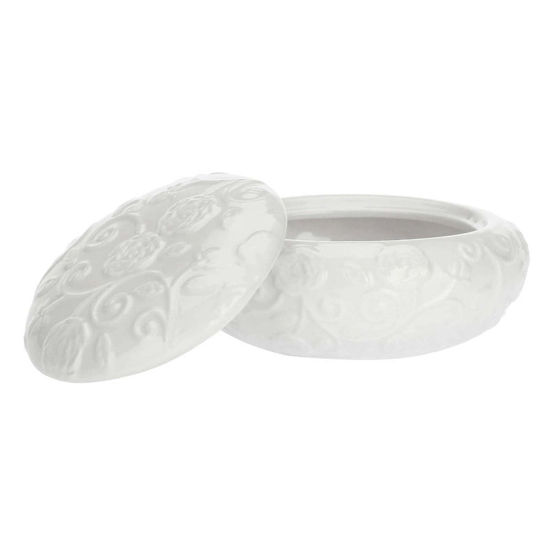Szczegółowy opis produktuPojemnik z pokrywką zdobiony rzeźbionym, roślinnym wzorem to urocze naczynie utrzymane w nurcie shabby chic, które idealnie sprawdzi się do przechowywania biżuterii, zegarków lub innych, cennych bibelotów bliskich twojemu sercu. Pojemnik dostępny jest w rozmiarach 10 cm i 12.5 cm i pięknie ozdobi każde twoje wnętrze.