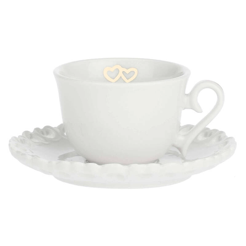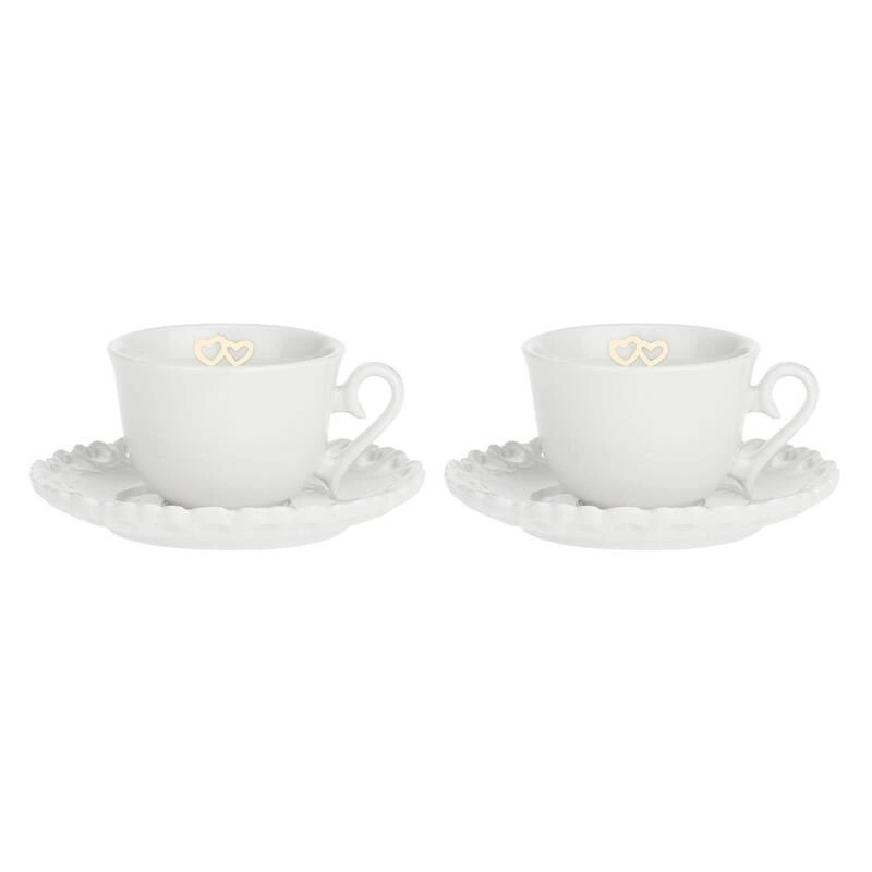 Zestaw 2 filiżanek do kawy z eleganckim spodkiem w zestawie to wisienka na torcie twojego serwisu kawowego. Urocze zdobienia w serduszka połączone z najwyższej jakości białą porcelaną sprawią, że picie kawy stanie się nadzwyczajnym przeżyciem.