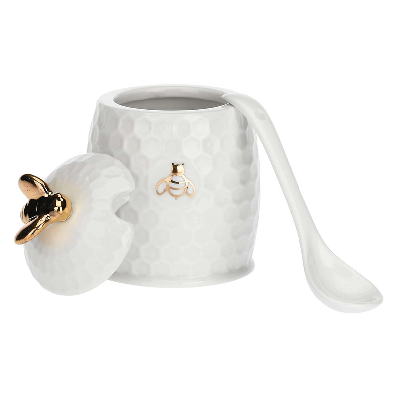 Cukiernica to elegancki i zgrabny dodatek z motywem plastra miodu oraz pszczółki, który urozmaici codzienne posiłki z rodziną i bliskimi. Cukiernica dostępna jest w rozmiarze o średnicy 6.5 cm w zestawie z dopasowaną pokrywką oraz porcelanową łyżeczką.