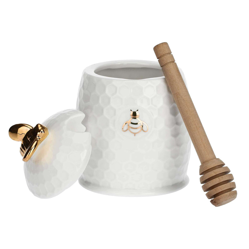 Szczegółowy opis produktuPojemnik na miód z wysokiej jakości włoskiej porcelany jest idealny do przechowywania i serwowania miodu podczas codziennego posiłku. Pojemnik w rozmiarze o średnicy 8 cm dostępny jest w zestawie z dopasowaną pokrywką zakończoną uchwytem w kształcie złotej pszczółki oraz łyżeczką.