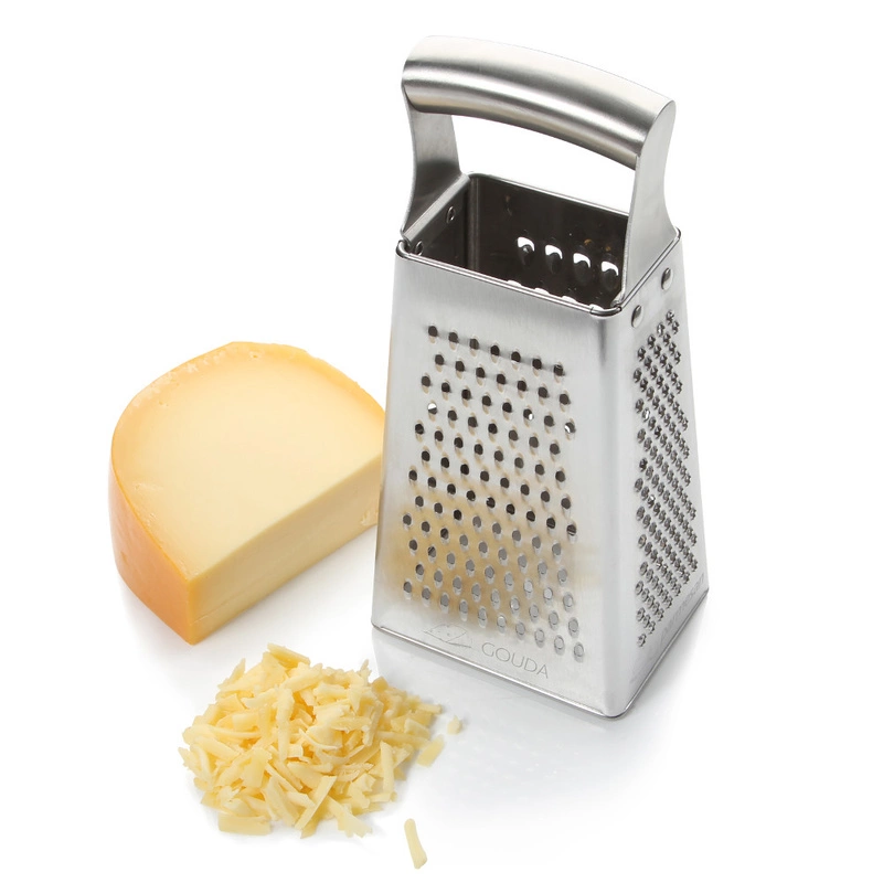Poręczna tarka 4-stronna do sera z linii Monaco+ i nie tylko! Tarka ma 3 rodzaje oczek: do ścierania na proszek, grube i średnie wiórki.