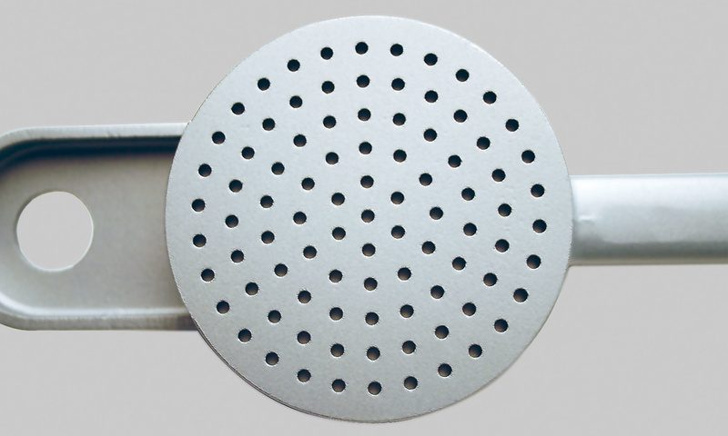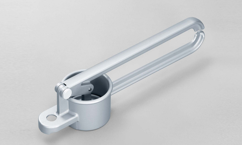 Na przeciwległym końcu znajduje się podpora z otworem umożliwiająca oparcie narzędzia na garnku w trakcie pracy, jak i jego zawieszenie na haczyku, gdy nie jest już używane.