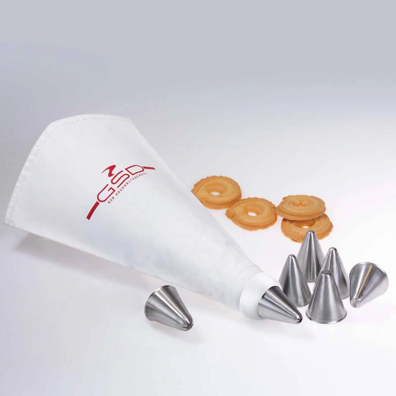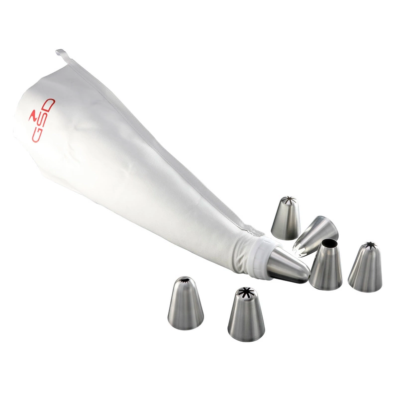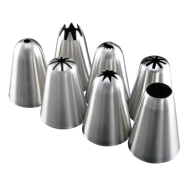 W zestawie jest 7 dysz ze stali nierdzewnej (5 gwiazdek o różnych rozmiarach i kształtach oraz 2 okrągłe o małej i dużej średnicy) o różnych kształtach i wzorach.