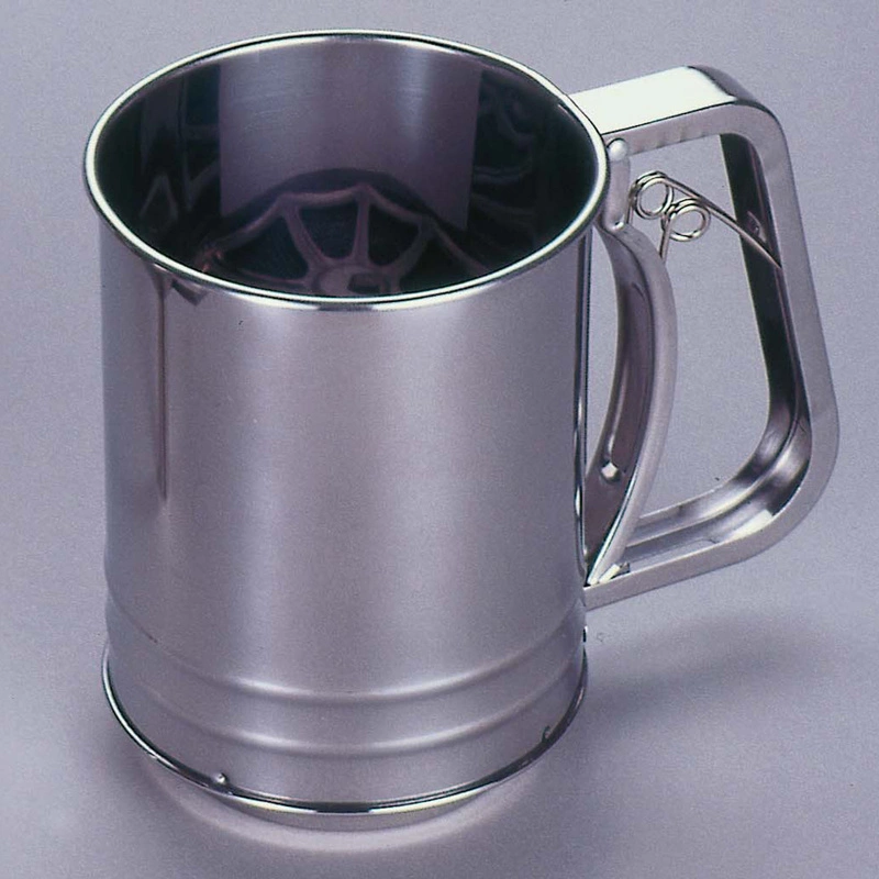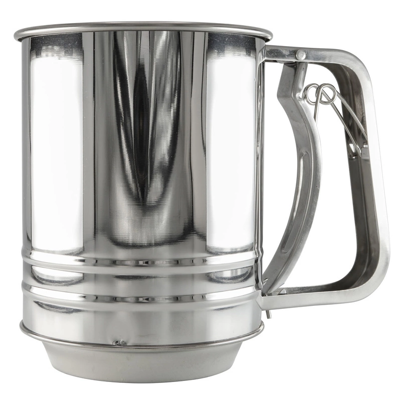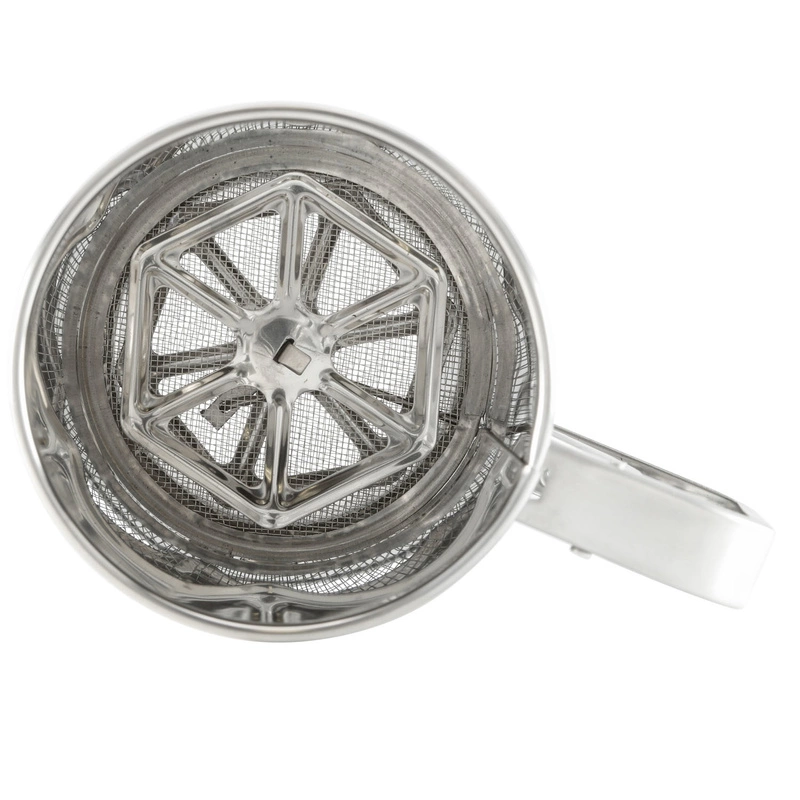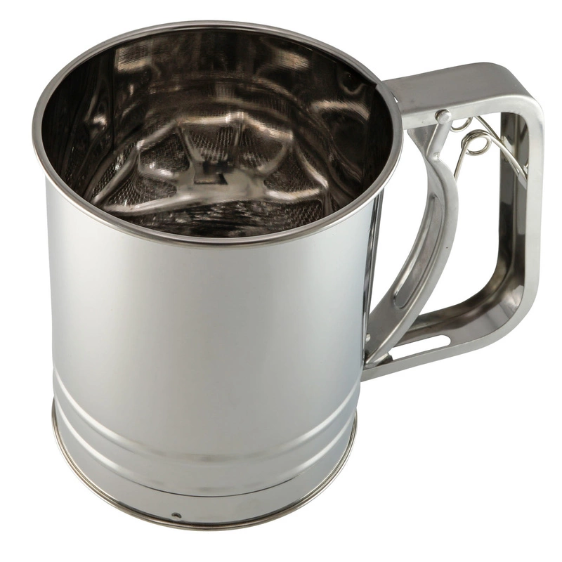 Duży i solidny przesiewak do mąki wykonany ze stali nierdzewnej.