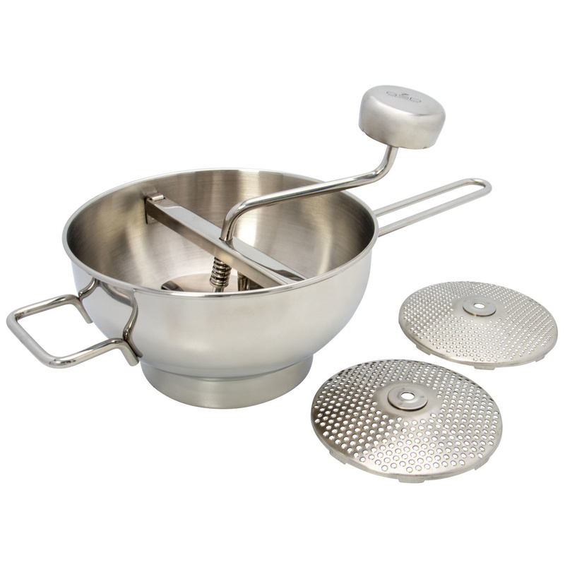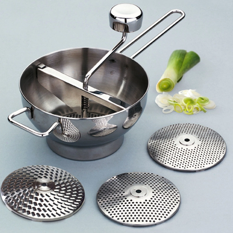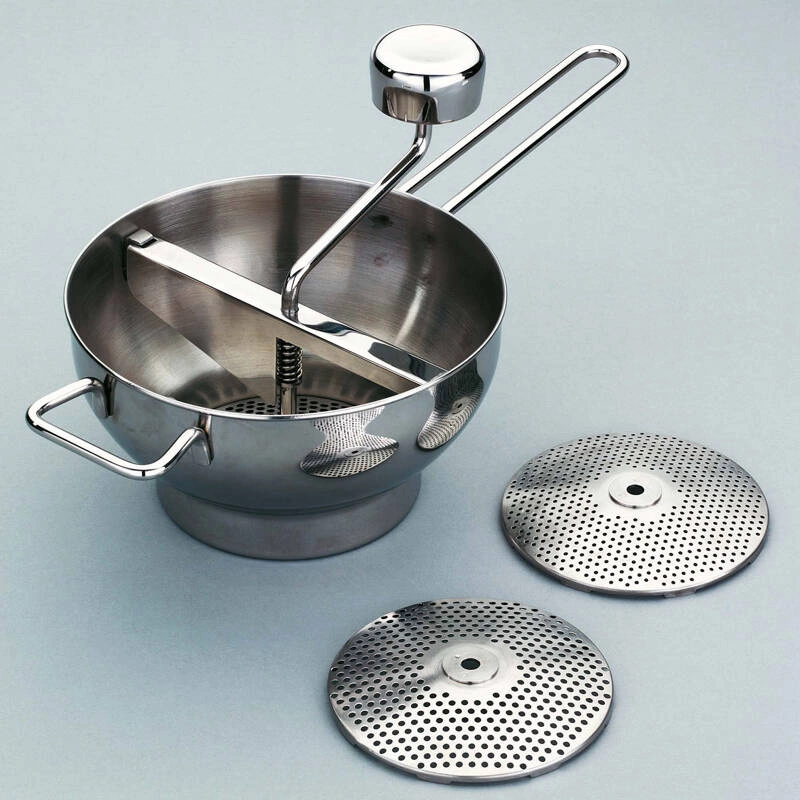 Przecierak do warzyw ze stali nierdzewnej z trzema wymiennymi perforowanymi dyskami.