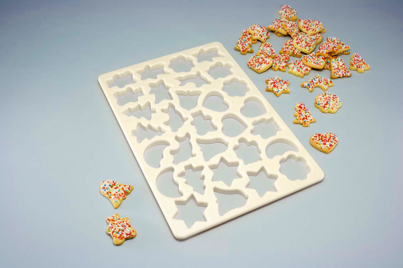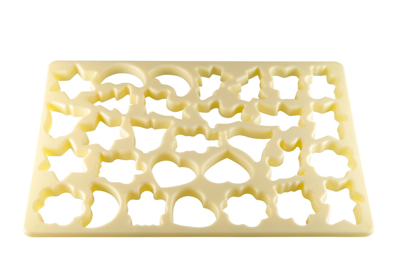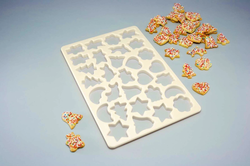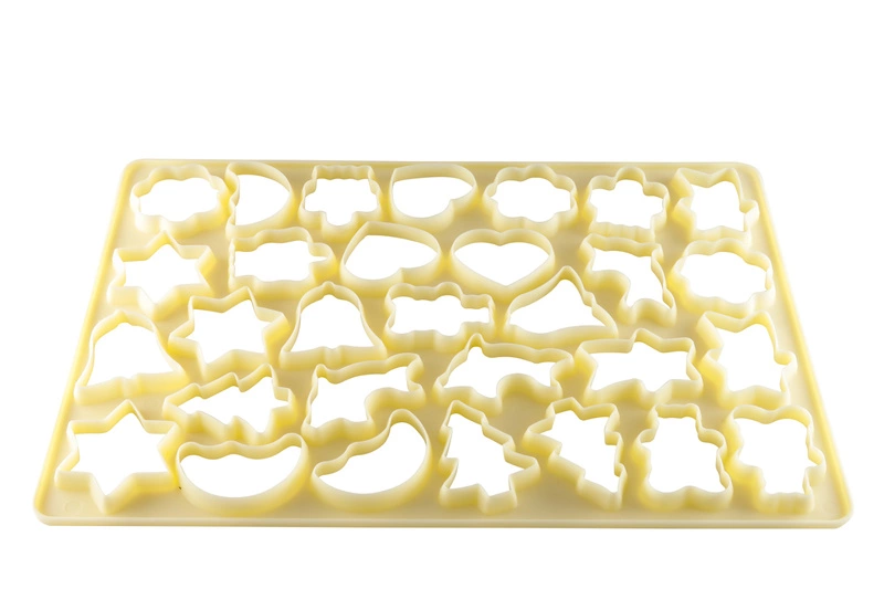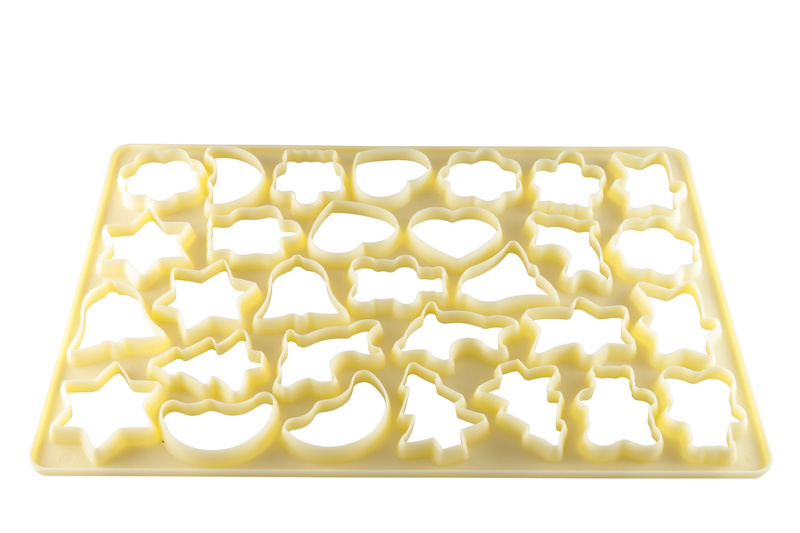 Forma do wycinania na 30 sztuk ciasteczek. Forma do wycinania pierniczków, herbatników różne kształty: gwiazdka, dzwonek, księżyc, choinka, kwiatek, delfin, serduszko, aniołek i niedźwiadek.