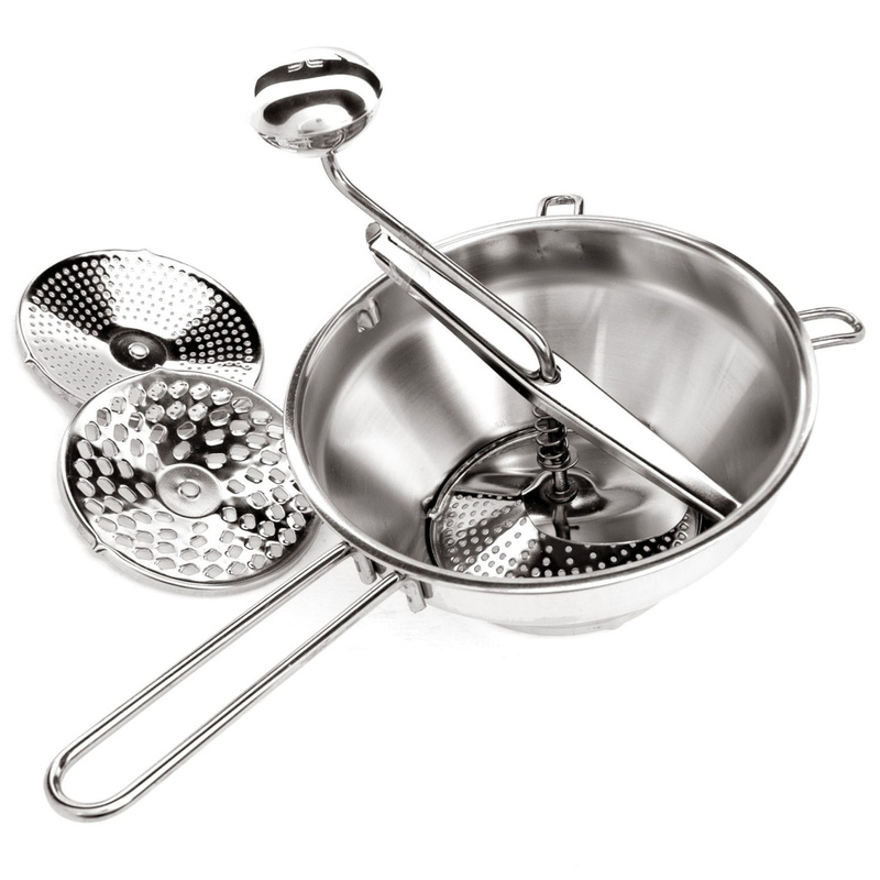 Profesjonalny przecierak ze stali nierdzewnej do warzyw z trzema wymienialnymi dyskami z różnymi otworami oraz opatentowanym szybkim przyłączem.