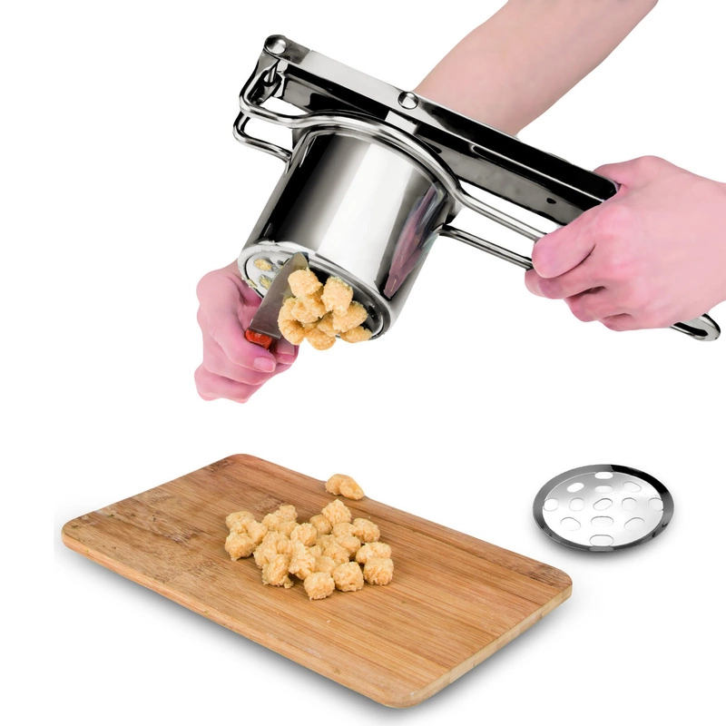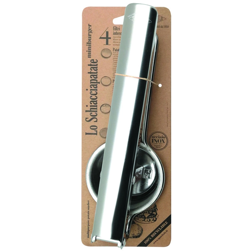 Praska do ziemniaków ze stali nierdzewnej z czterema wymienialnymi filtrami: - do prasowania ziemniaków, - do przygotowywania włoskiego Passatelli, - do przygotowywania gnocchi i spätzle, - do przygotowywania domowych mini hamburgerów.