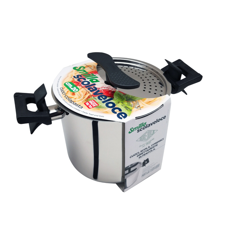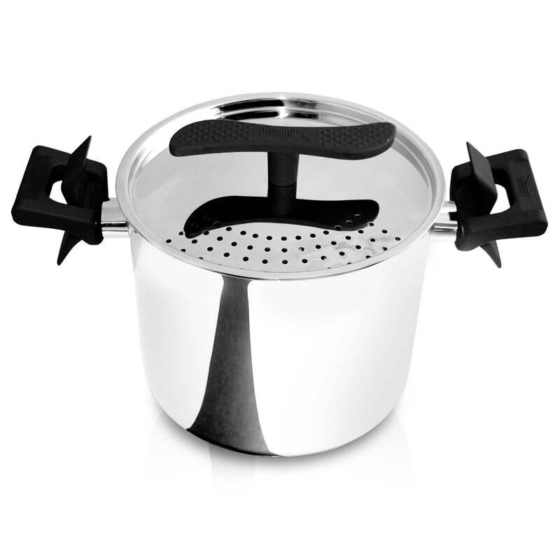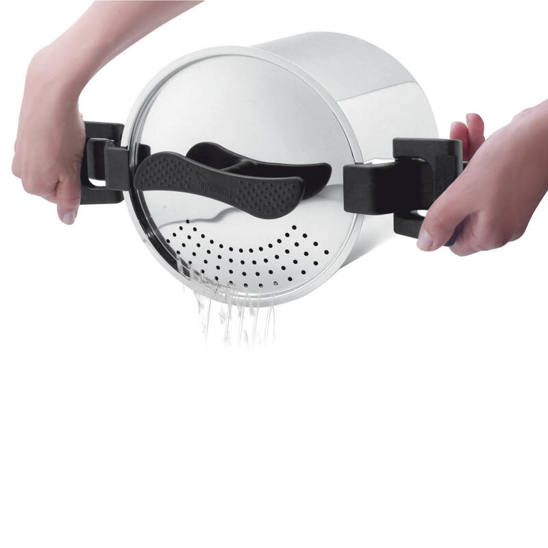 Garnek DUSPAGHI do makaronu z funkcją odcedzania i opatentowaną blokadą pokrywki.