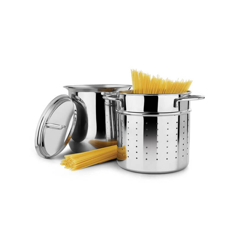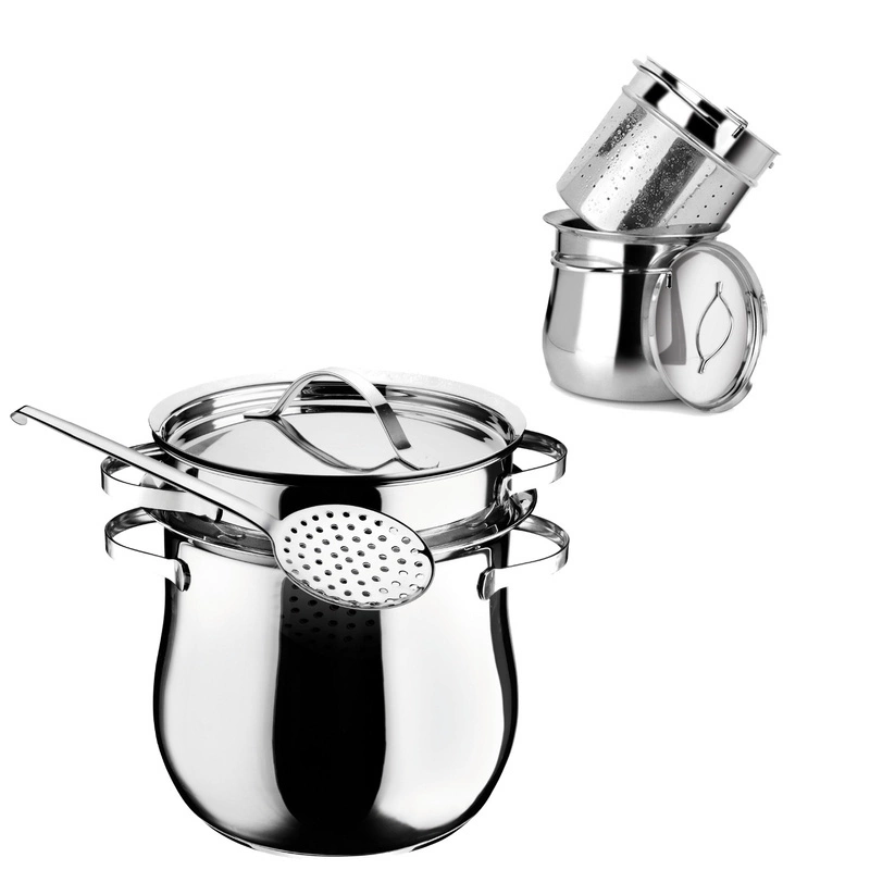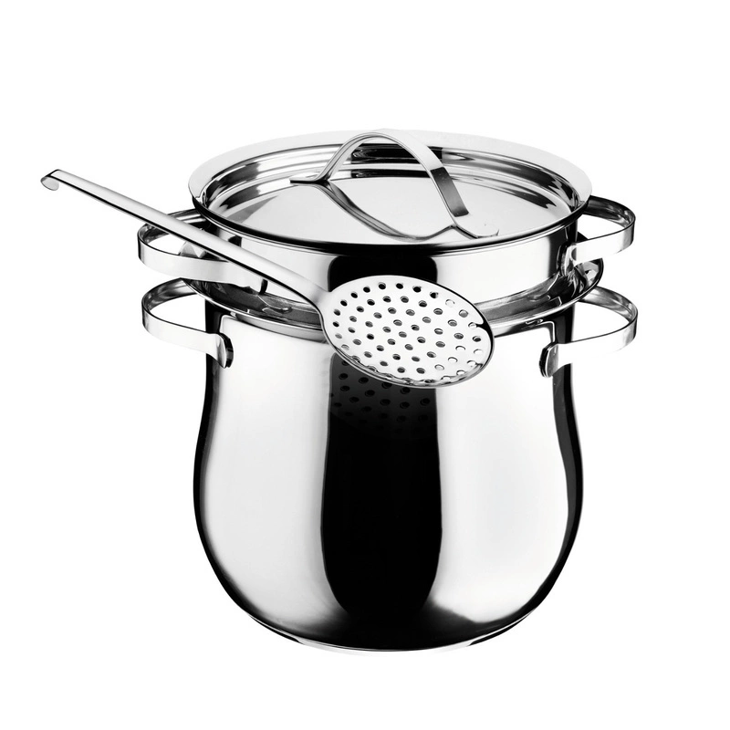 Tradycyjny kształt garnka ogranicza rozchlapywanie wody zarówno w trakcie gotowania makaronu jak i jego odlewania.