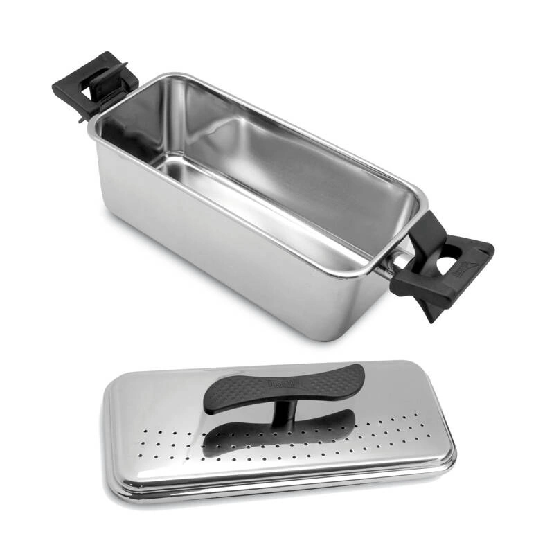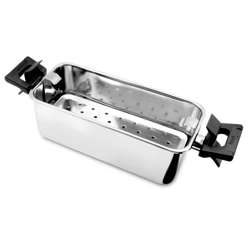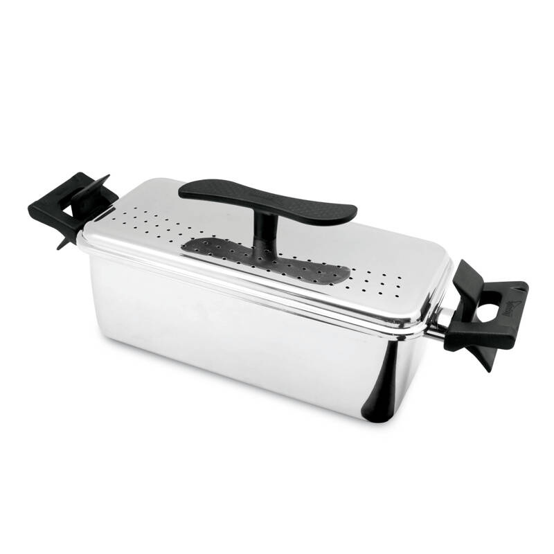 Podłużny garnek z pokrywą oraz wkładka wykonane są ze stali nierdzewnej, uchwyt z tworzywa.