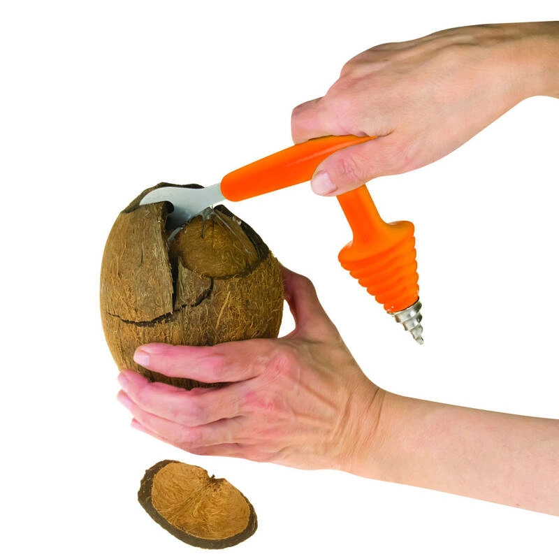 Ten innowacyjny i opatentowany produkt zawiera w sobie dwa narzędzia. Za pomocą jednego można wywiercić w owocu otwór i wylać wodę, natomiast drugie umożliwia rozłupanie kokosa na części i pozyskanie miąższu. Wymiary brutto: 19x14x3,5cm. Wymiary netto: 17,5x12x3,5cm. Waga brutto: 0,099kg. Waga netto: 0,080kg.