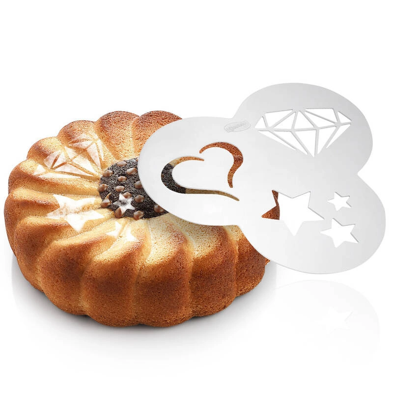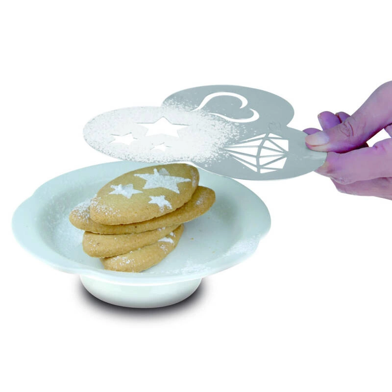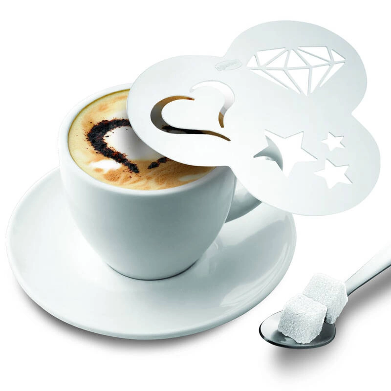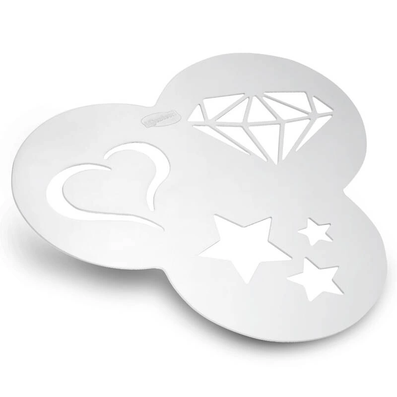 Szablon ze stali nierdzewnej z trzema wzorami (diament, serce, gwiazdki) do dekorowania Cappuccino lub ciastek kakałem bądź cukrem pudrem.