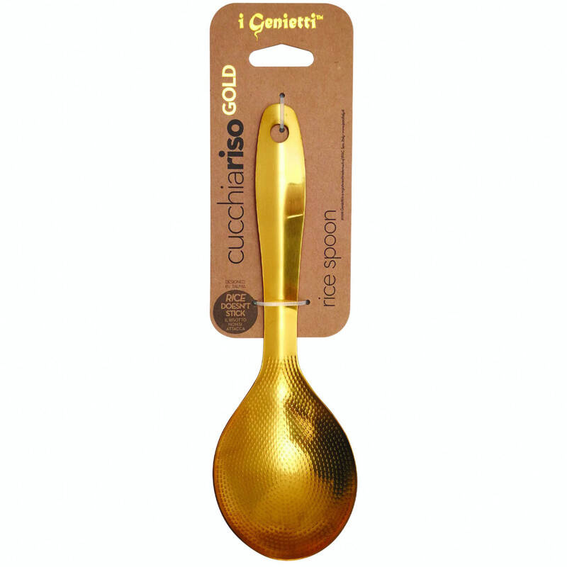 Łyżka ze stali nierdzewnej o złotym wykończeniu oraz punktowanej powierzchni, która zapobiega przyklejaniu się ryżu.