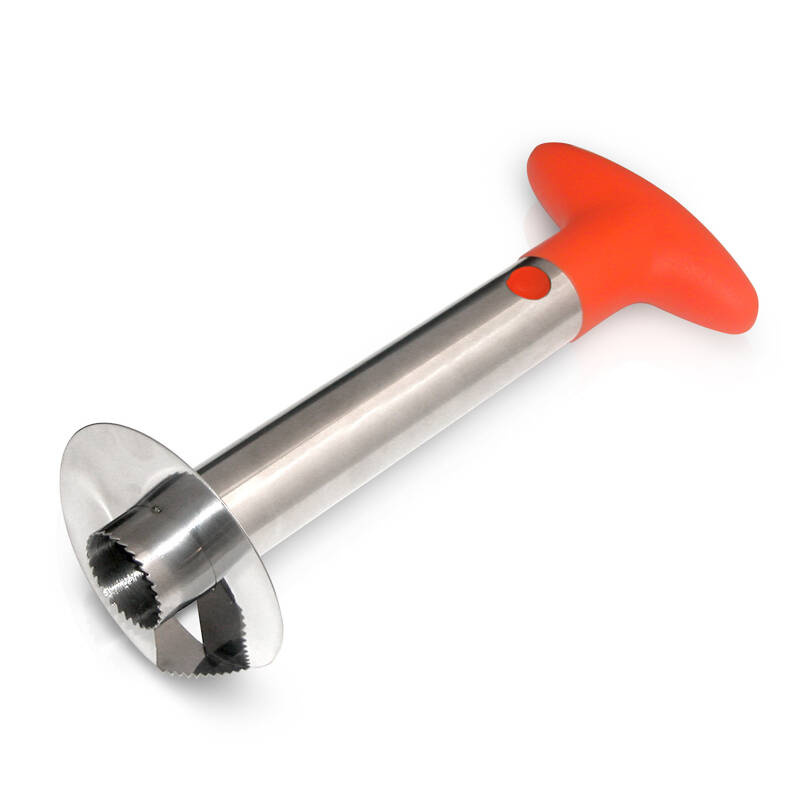Instrukcja: - odetnij górę i dół ananasa; - ustaw owoc stabilnie na desce; - wkręcaj nóż drążarki w owoc zgodnie z ruchem wskazówek zegara; - zwolnij rączkę - przycisk z boku; - wypchnij wycięty miąższ wraz z drążarką; - zsuń miąższ, usuń rdzeń ananasa.
