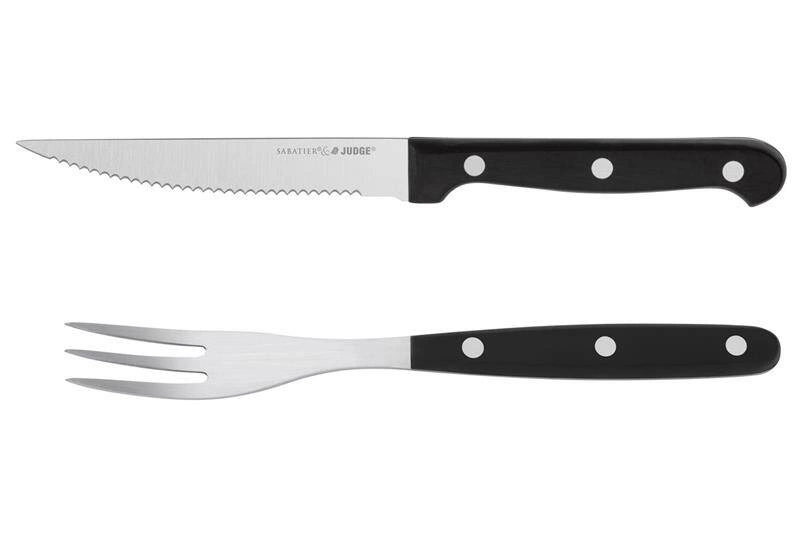Zestaw sztućców do steaków na 6 osób angielskiej marki Judge. Dzięki ostrym ząbkowanym ostrzom bez problemu pokroisz steki. Rączka wykona jest z lekkiego czarnego tworzywa. Komplet jest łatwy w czyszczeniu, sztućce można myć w zmywarce, można go skompletować z innymi produktami z tej samej firmy. Doskonale sprawdzi się podczas letniego grillowania