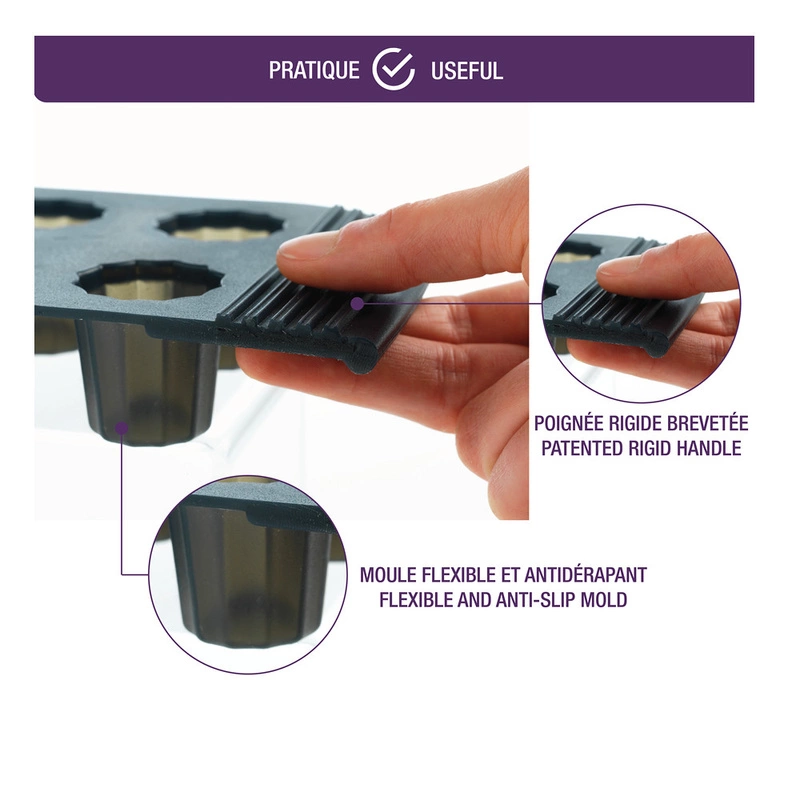 Forma ma wygodne rączki wzmocnione zatopionym w silikonie metalem, aby łatwo było wkładać i wyjmować ją z piekarnika lub zamrażarki.Silikon jest wytrzymały na niskie i wysokie temperatury (od -40 do 220 stopni).