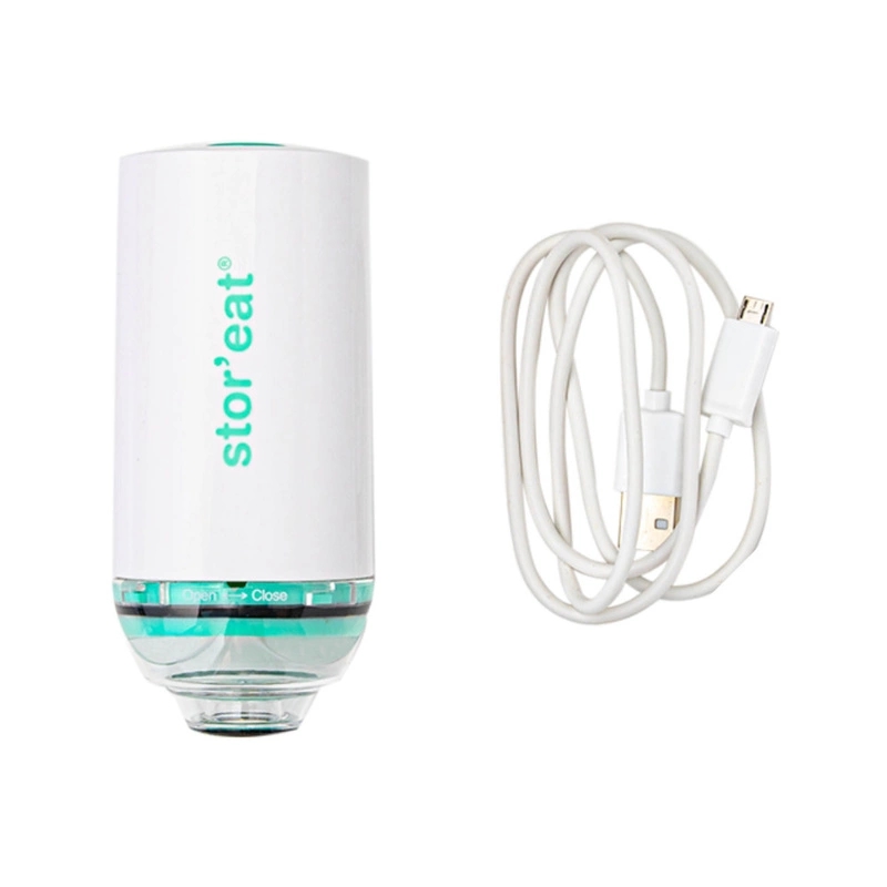 W skład zestawu wchodzi: pompka próżniowa, kabel USB do ładowania, 2 klipsy metalowe, 1 klips do zamykania, 5 woreczków 1,3L, 5 woreczków 3L, 10 kodów QR.