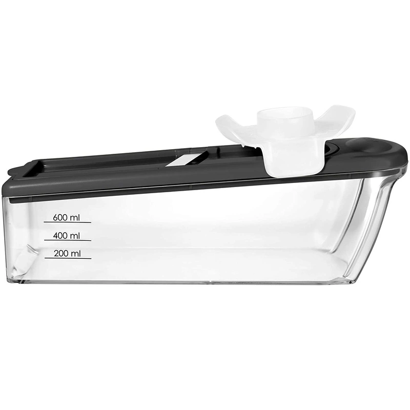 Pojemnik szatkownicy ma rozrysowaną podziałkę od 200 do 600 ml, dzięki niej z łatwością odmierzysz potrzebną ilość startych produktów.