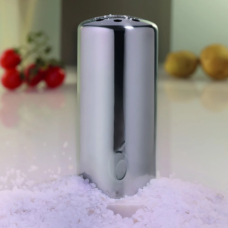 Shaker do grubej soli ze stali nierdzewnej o błyszczącej powierzchni.