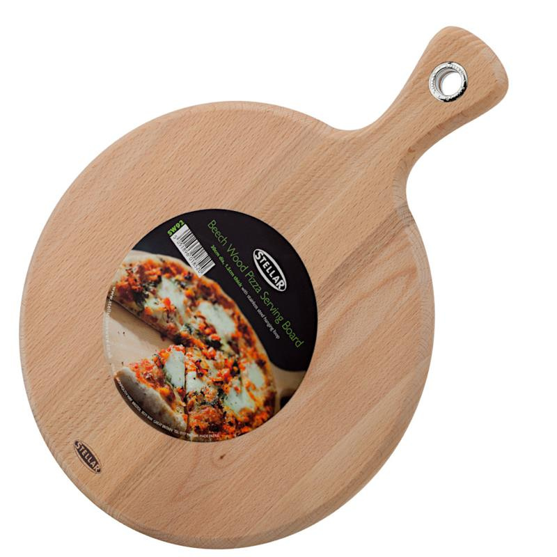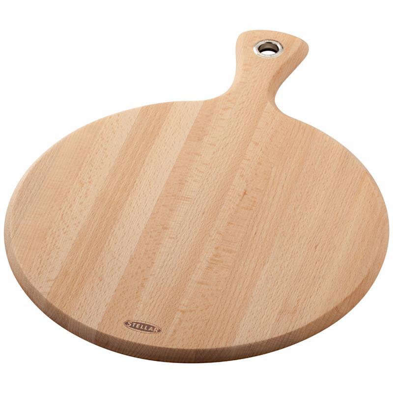 Deska do serwowania pizzy i nie tylko, z naturalnego drewna bukowego o grubości 1,5 cm, ze stalowym oczkiem do zawieszenia.