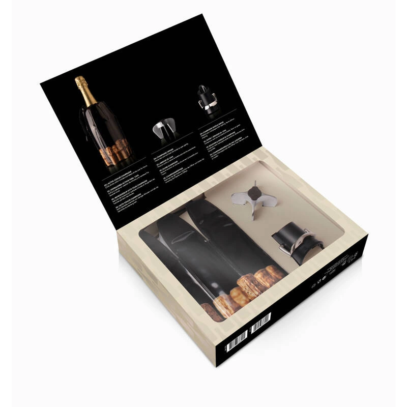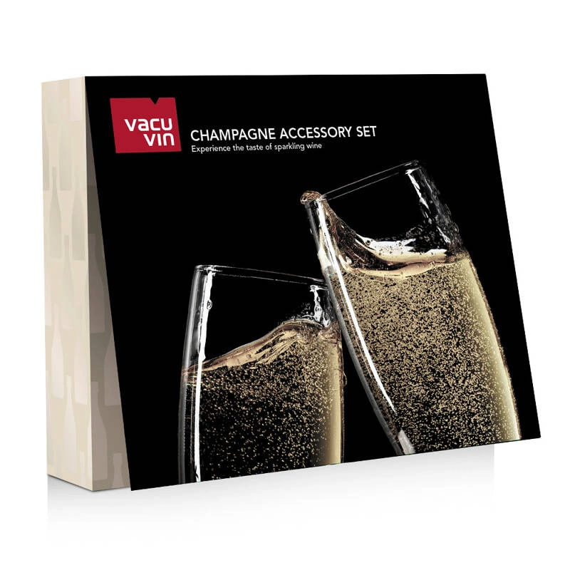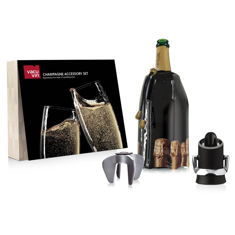 Zestaw akcesoriów do szampana Vacu Vin to schładzacz do szampana, otwieracz i korek z nalewakiem.