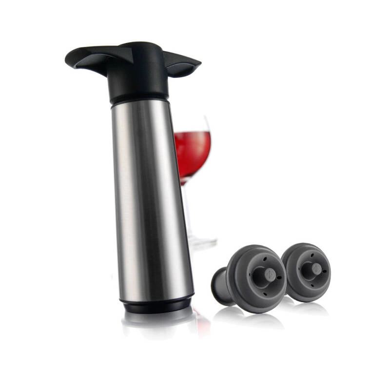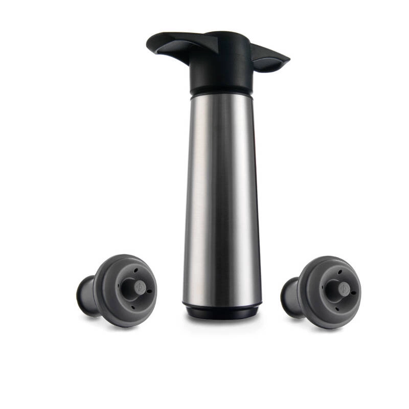 Komplet zawierający pompkę próżniową stalową do wina oraz 2 korki próżniowe.