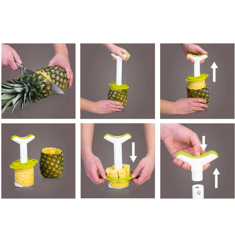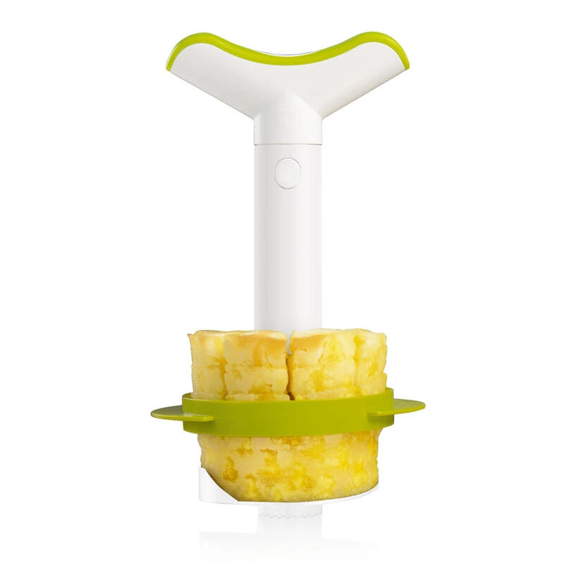 Pomysłowa drążarka obierze ze skórki, usunie rdzeń ananasa i pokroi świeży owoc w 30 sekund.