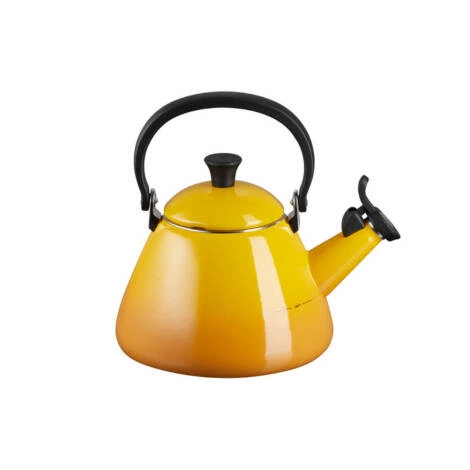Czajniki Le Creuset Kone wyposażone są w ruchomą, składaną, nienagrzewającą się rączkę i podnoszony mocowany na stałe do dziubka gwizdek.