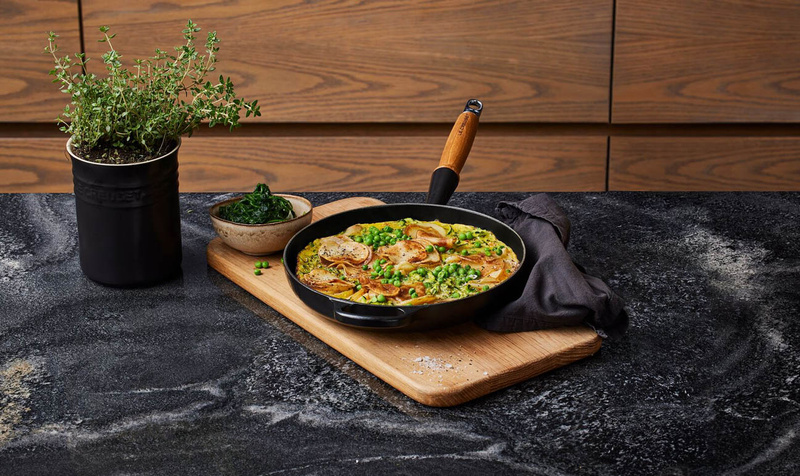 Eleganckie procesy starzenia: Wnętrze pokryte emalią nabiera naturalnej patyny, oferującej właściwości zbliżone do nieprzywierającej powłoki. Taka obróbka przeciwdziała przywieraniu potraw, co z kolei pozwala na ograniczenie ilości używanych przypraw. Zachęcamy do czyszczenia produktu jedynie za pomocą wody, aby umożliwić wykształcenie się pożądanej patyny.