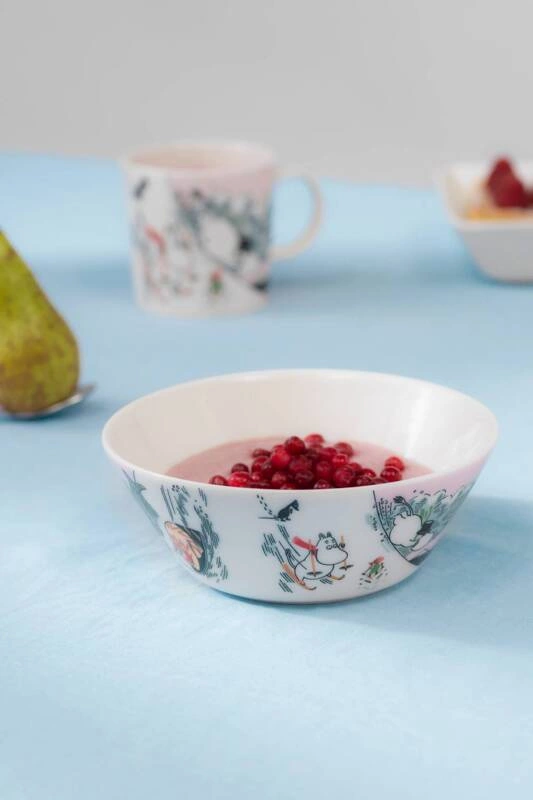 Miseczka Muminki Sliding fińskiej marki Arabia z serii porcelany poświęconej postaciom z książek Tove Jansson. Autorka znanych i lubianych książek o Muminkach zaakceptowała pierwsze grafiki podczas powstawania muminkowej porcelany.