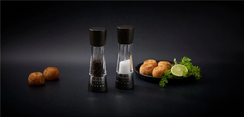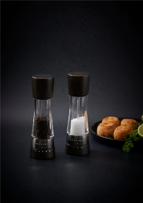 Zestaw eleganckich młynków do soli i pieprzu Derwent angielskiej marki Cole & Mason, znanej na rynkach międzynarodowych, jako producenta wysokiej jakości młynków do przypraw.