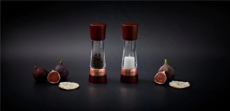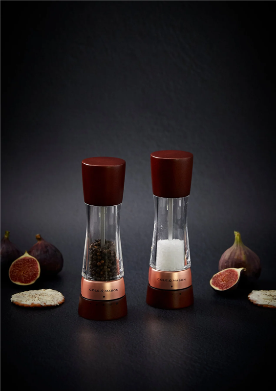 Zestaw eleganckich młynków do soli i pieprzu Derwent angielskiej marki Cole & Mason, znanej na rynkach międzynarodowych, jako producenta wysokiej jakości młynków do przypraw.