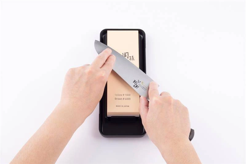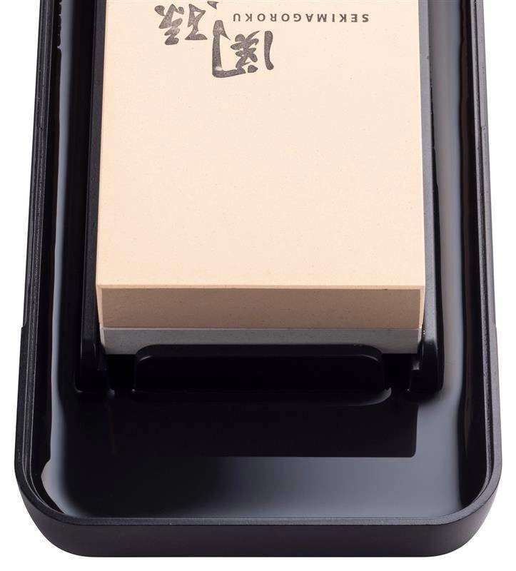 Kamień do ostrzenia noży, w etui z gumową antypoślizgową podstawą. Górna część pudełka może być użyta do namoczenia kamienia. Podstawa natomiast wyposażona jest w specjalną perforację podtrzymującą kamień podczas ostrzenia.