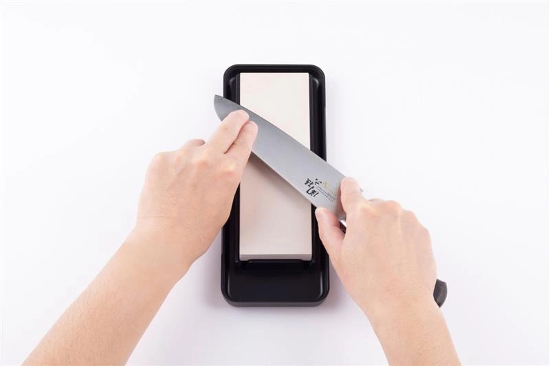 Kamień do ostrzenia noży, w etui z gumową antypoślizgową podstawą. Górna część pudełka może być użyta do namoczenia kamienia. Podstawa natomiast wyposażona jest w specjalną perforację podtrzymującą kamień podczas ostrzenia.