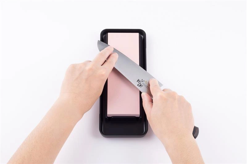 Kamień do ostrzenia noży, w etui z gumową antypoślizgową podstawą. Górna część pudełka może być użyta do namoczenia kamienia. Podstawa natomiast wyposażona jest w specjalną perforację podtrzymującą kamień podczas ostrzenia.