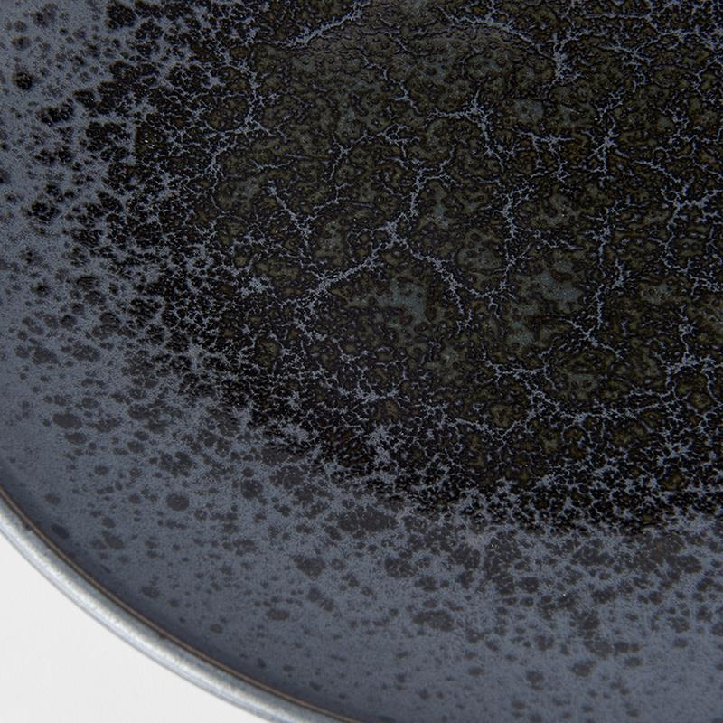 Okrągły talerz do podawania dań, np. przystawek, wyśmienitych dań. Glazura Black Pearl zawiera intrygujące plamy błyszczącej czarnej glazury na matowym, również czarnym tle. Subtelne refleksy cyjanu podkreślają głębię połysku.