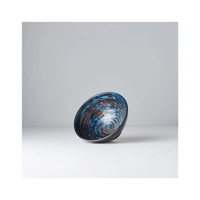 Miska do podawania dań, np. sałatek. Ręcznie zdobiona miska utrzymana jest w kolorystyce niebiesko-czarno-brązowej, z spiralnym żłobieniem. Naczynie jest pokryte błyszczącą glazurą, która podkreśla kontrast kolorów i nadaje elegancji. Między poszczególnymi egzemplarzami misek mogą istnieć drobne różnice, co czyni każdą z nich unikalną i niepowtarzalną.