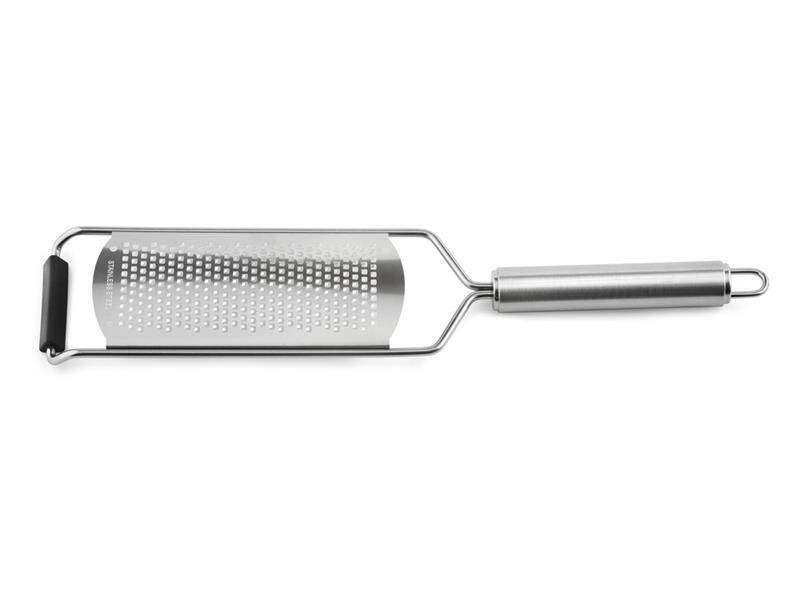 Ergonomiczna, stalowa rękojeść zakończona jest otworem, umożliwiającym przechowywanie tarki na haczyku. Do tarki dołączona jest osłona zabezpieczająca ostrze.