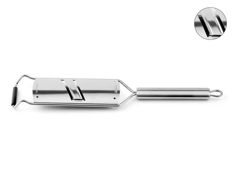 Prezentowana tarka posiada podłużne, poprzecznie ułożone ostrza, które są doskonałe do plastrowania warzyw.