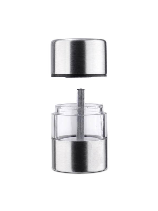 Obudowa młynka jest wykonana z przezroczystego akrylu oraz matowej stali nierdzewnej.