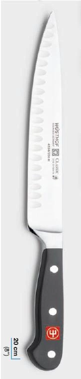 Uniwersalny nóż do krojenia z serii Classic niemieckiej firmy Wusthof. Posiada specjalne wgłębienia w ostrzu, dzięki, którym krojone potrawy nie przyklejają się do noża oraz można kroić w na prawdę cienkie plasterki.