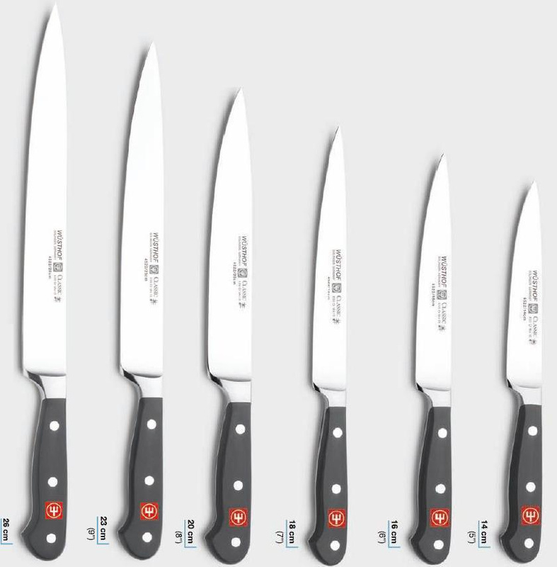 Nóż kuchenny z serii Classic, niemieckiej firmy Wusthof. Jego podstawową funkcją jest krojenie w cienkie lub grube plastry.