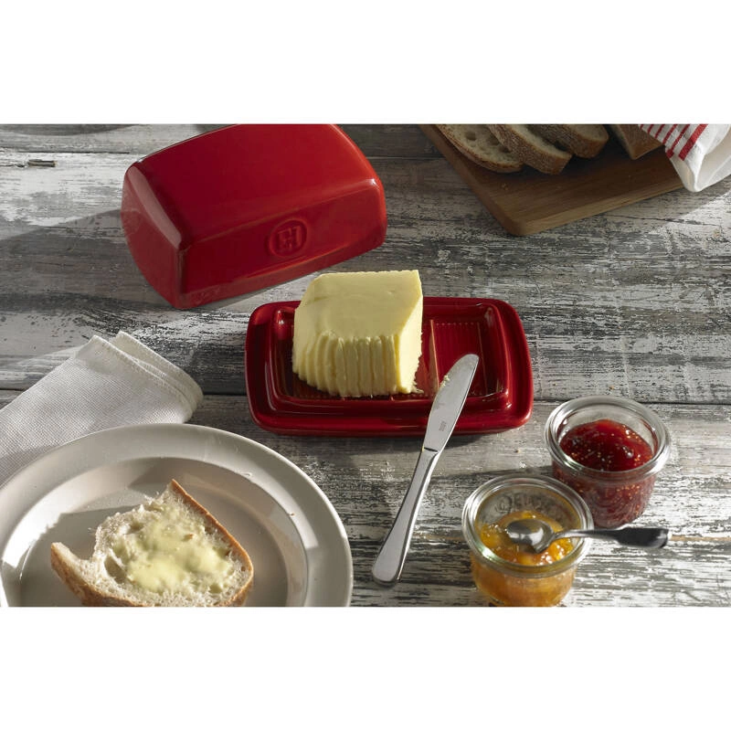 Maselniczka Emile Henry chroni Twoje masło przed światłem i powietrzem. Nawet po wyjęciu z lodówki utrzymuje świeżość masła dzięki ceramice HR (High Resistance), która dłużej pozostaje zimna. Przy podawaniu na stole lub do wykorzystania w trakcie pracy w kuchni maselniczka jest poręczna: wypukłości na dnie zapobiegają przesuwaniu się masła podczas krojenia.