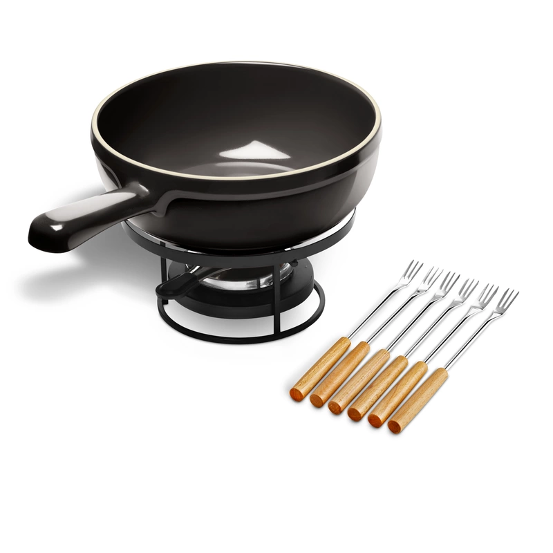 Tradycyjne serowe fondue zawsze było robione w ceramicznym garnku, który wcześniej został natarty czosnkiem. Dzięki ceramicznegu naczyniu Emile Henry możemy przygotować fondue we własnej kuchni. Garnek delikatnie rozproszy ciepło i utrzyma ciepło przez cały czas trwania posiłku. W skład zestawu do fondue wchodzi garnkiek, palnik, stojak i 6 widelców.