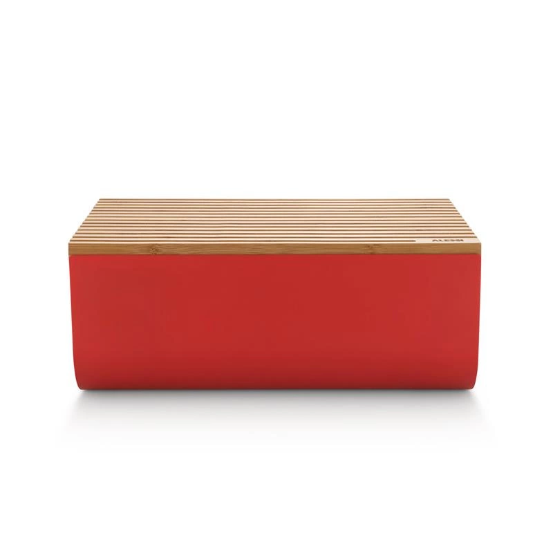 Chlebak ze stali pokrytej żywicą epoksydową z deską do krojenia z drewna bambusowego, czerwony.