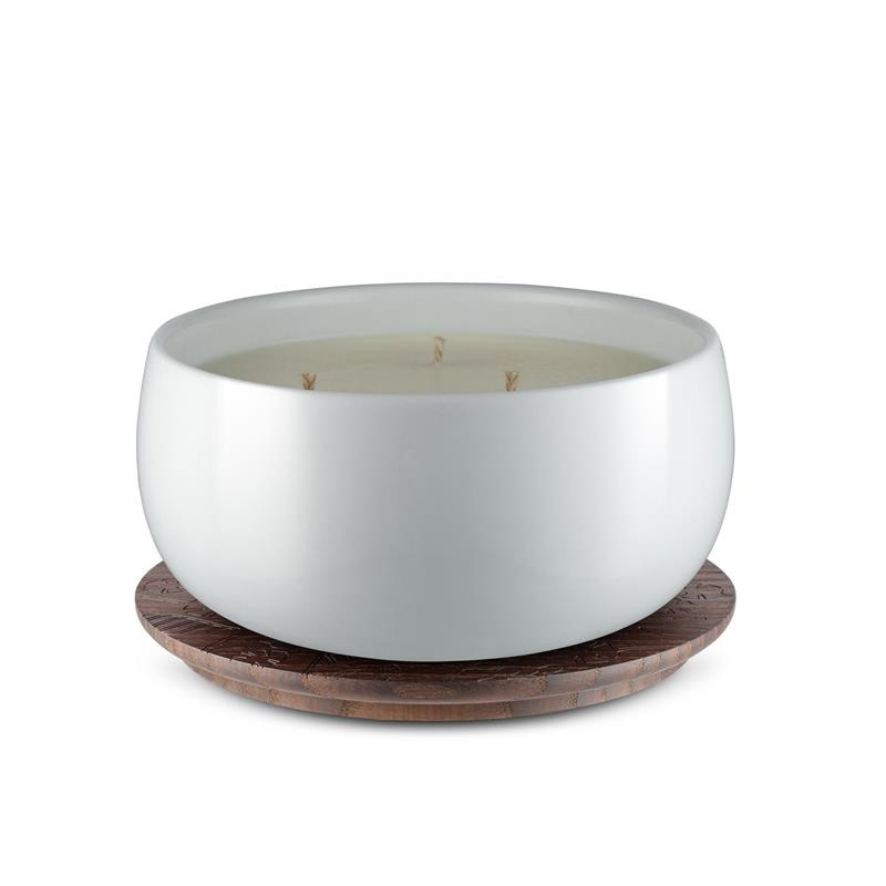 biały porcelanowy pojemnik wyposażony w drewnianą pokrywkę z dekorem, która może pełnić funkcję podstawki pod świecę