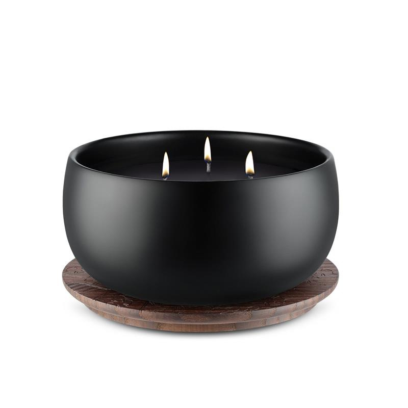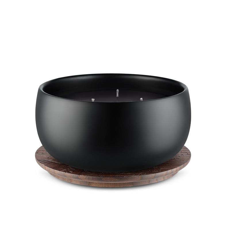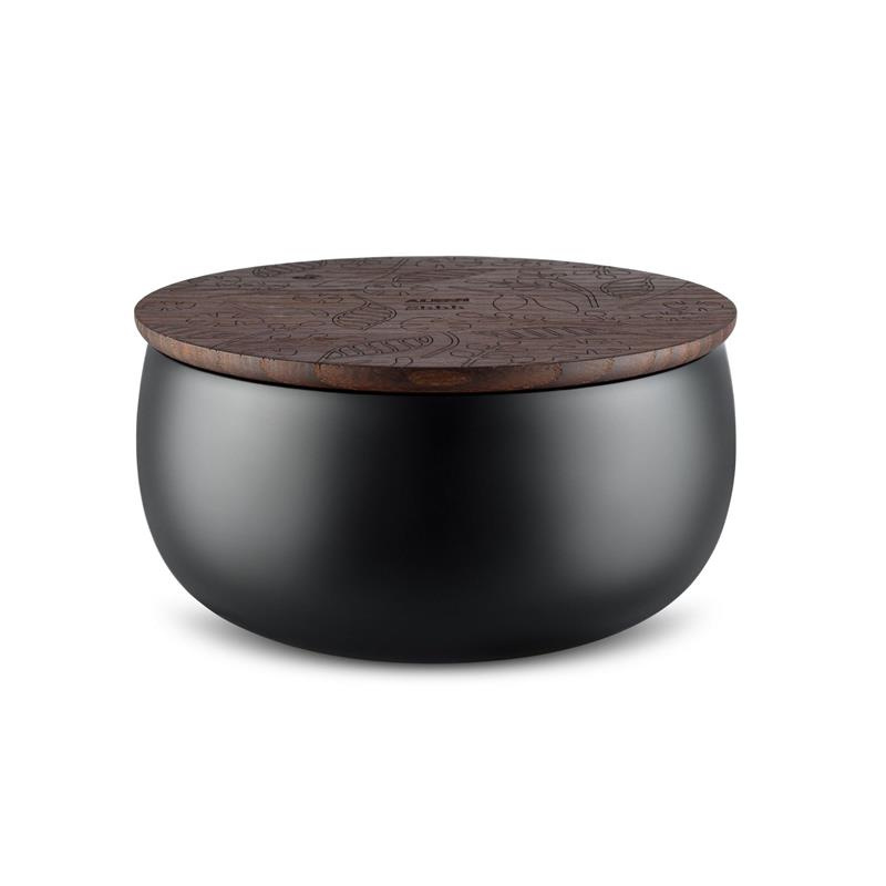 czarny porcelanowy pojemnik wyposażony w drewnianą pokrywkę z dekorem, która może pełnić funkcję podstawki pod świecę