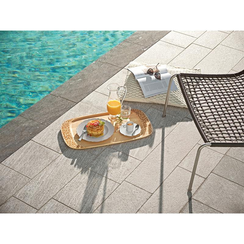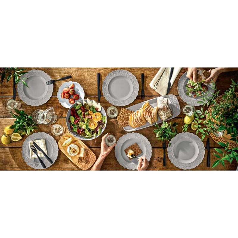 Talerz do jadalni z melaminy z reliefową dekoracją, kolor ciepły szary. Pakowane po 4 sztuki. Sztućce i talerze do serwowania są wykonane z melaminy. Jest to materiał o doskonałych parametrach termicznych, odpowiedni zarówno na gorąco jak i zimne jedzenie. Wszystkie przedmioty z kolekcji Dressed en plener są bezpieczne dla żywności, ponieważ są całkowicie wolne od bisfenolu A (BPA). Wszystkie elementy można myć w zmywarce w maksymalnej temperaturze 60 ° C; wskazane jest umieszczenie zastawy w górnym stojaku. - Nie nadaje się do stosowania w kuchenkach mikrofalowych i tradycyjnych piekarnikach. Projektant- Marcel Wanders