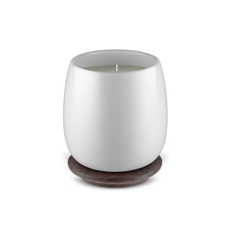 biały porcelanowy pojemnik wyposażony w drewnianą pokrywkę z dekorem, która może pełnić funkcję podstawki pod świecę
